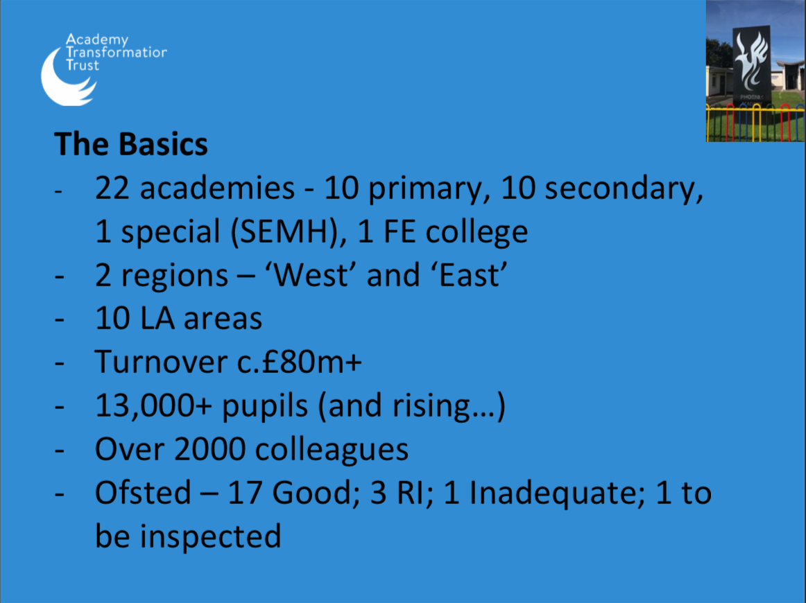 I’m Debbie Clinton, the Chief Executive Officer of Academies Transformation Trust and I have been in post since September of 2018. A bit about my background: Secondary headteacher (named in the House of Commons!) and all these accolades that actually were very precious to me at the time. And then I left all of that to join the dark side and become an HMI (forgive me!) but it was very useful. Then I went over to the Diverse Academy Learning Partnership in the East Midlands to be the deputy CEO and then acting CEO of a much smaller trust than the one I work with now. And then, obviously I mentioned that I started at ATT just over a year ago, and I’m loving it. But it’s also a bit loony, which we’ll come to.