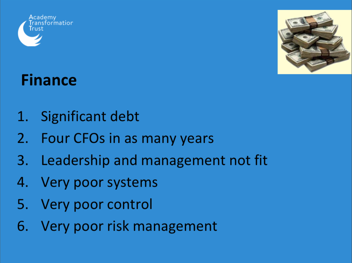 (Image 2: A slide taken from Debbie Clinton’s presentation showing key financial problems within the Academy Transformation Trust)