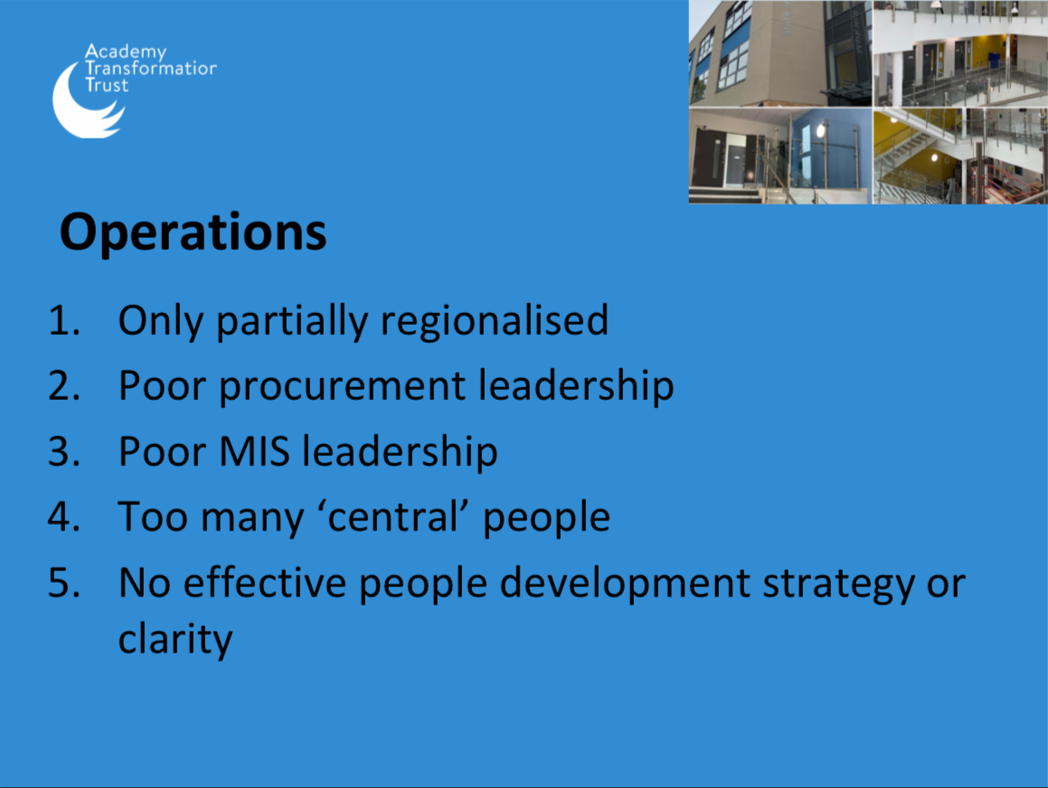Absolutely. It’s a picture that I recognised from my inspection life as well. With regard to operations, you’ve got to think about the context. 22 academies, 10 local authority areas across East and West regions, massive geographical challenges and a massive geographical understanding that needs to be grasped that wasn’t. So, we’ve done quite a lot with H.R., which is getting there and ICT, which wasn’t regionalised – I mean how do you not regionalise IT and MIS? How can you not actually make sure that the very architecture on which you build your MAT has been properly regionalised?