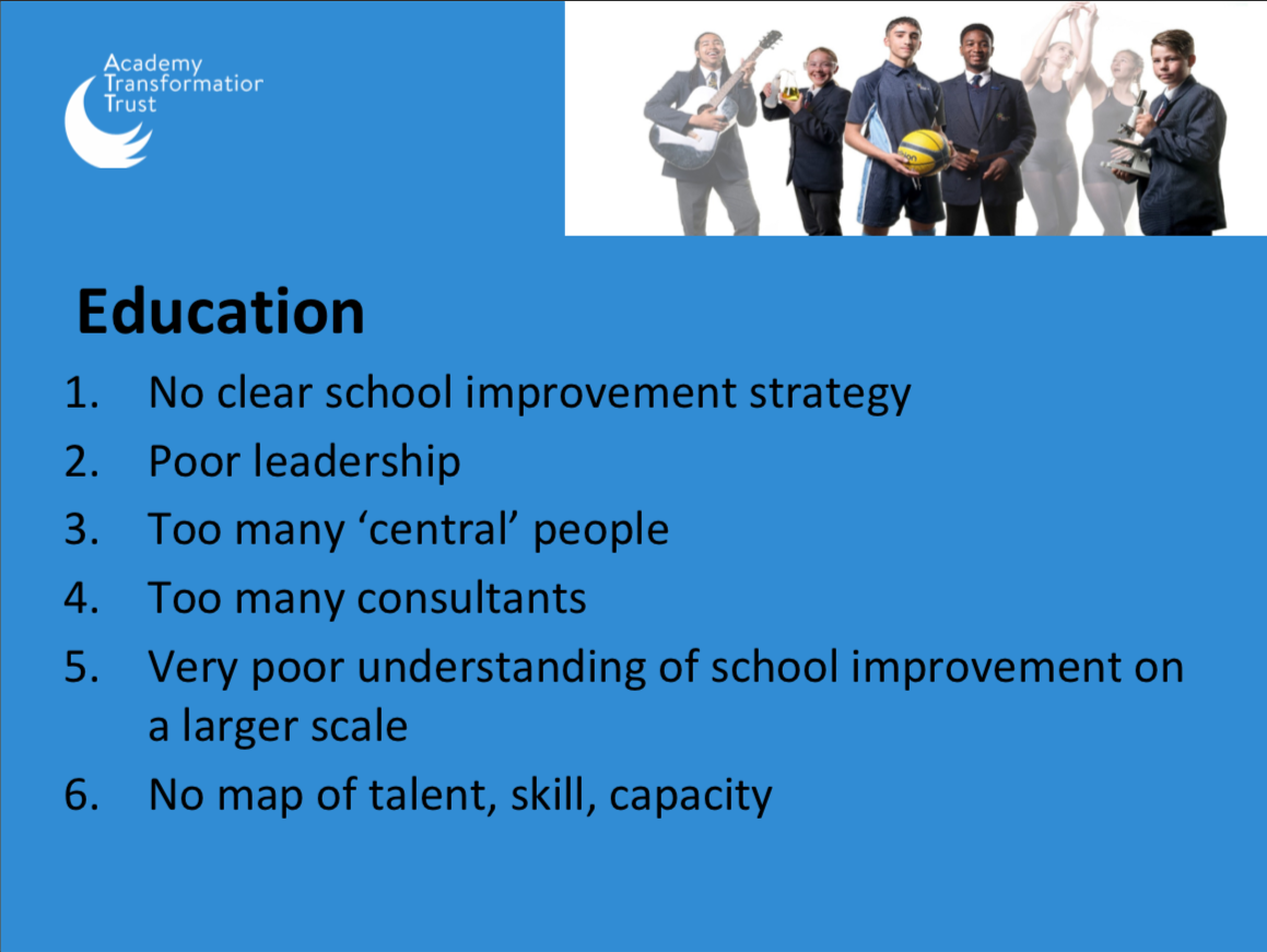 (Image 4: A slide taken from Debbie Clinton’s presentation showing key education problems within the Academy Transformation Trust)