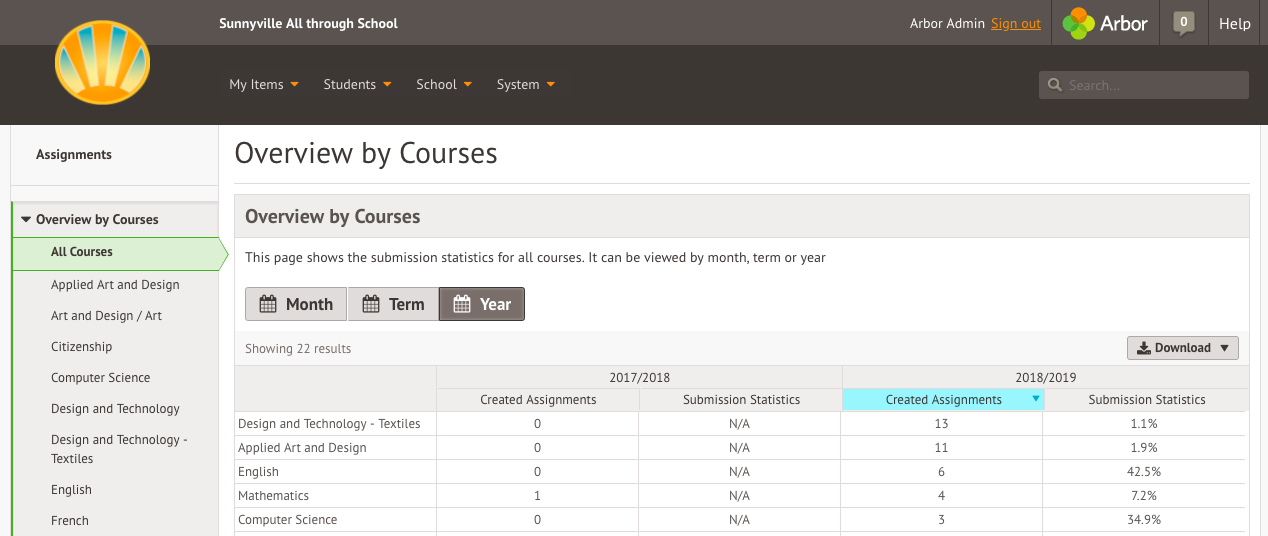 - In the “Overview by Courses” section, you can see the number of assignments created and the submission statistics for each course in your school by month, term or academic year. Based on what you want to look at in more detail, or if there are any areas you want to follow up on, you can drill down to see the number of assignments created and the submissions statistics for each year group and each class within that year group. You can also see the assignment submissions for specific students in a class and across all their classes with the grades and/or comments for each assignment they submitted.