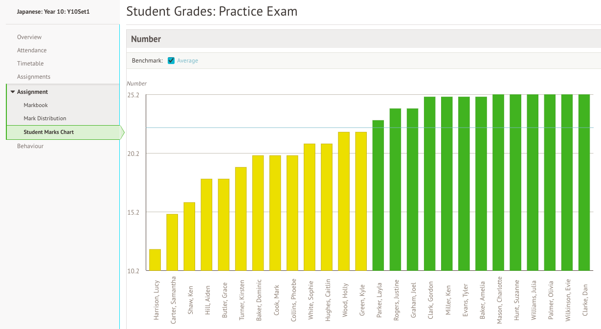 Fig. 2 – A Student Marks Chart automatically generated for a marked assignment in Arbor MIS – the colour splits the marks down the median, the blue line shows the mean, and hovering over each bar shows further student level information