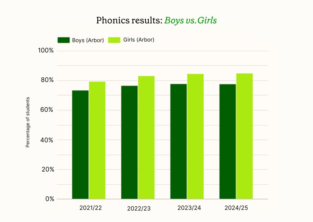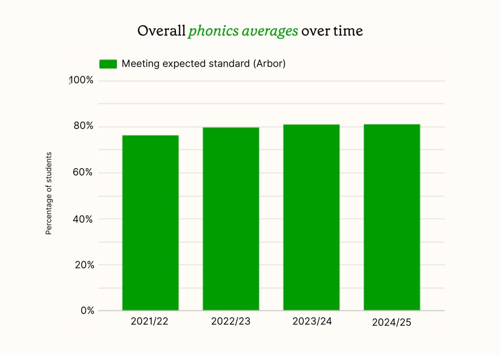 The 2024/25 phonics results show that 81% of students met the expected standard, representing a slight increase from 80.9% in 2023/24. This continues the upward trend we’ve observed since 2021/22, when 76.2% of students achieved the expected standard.