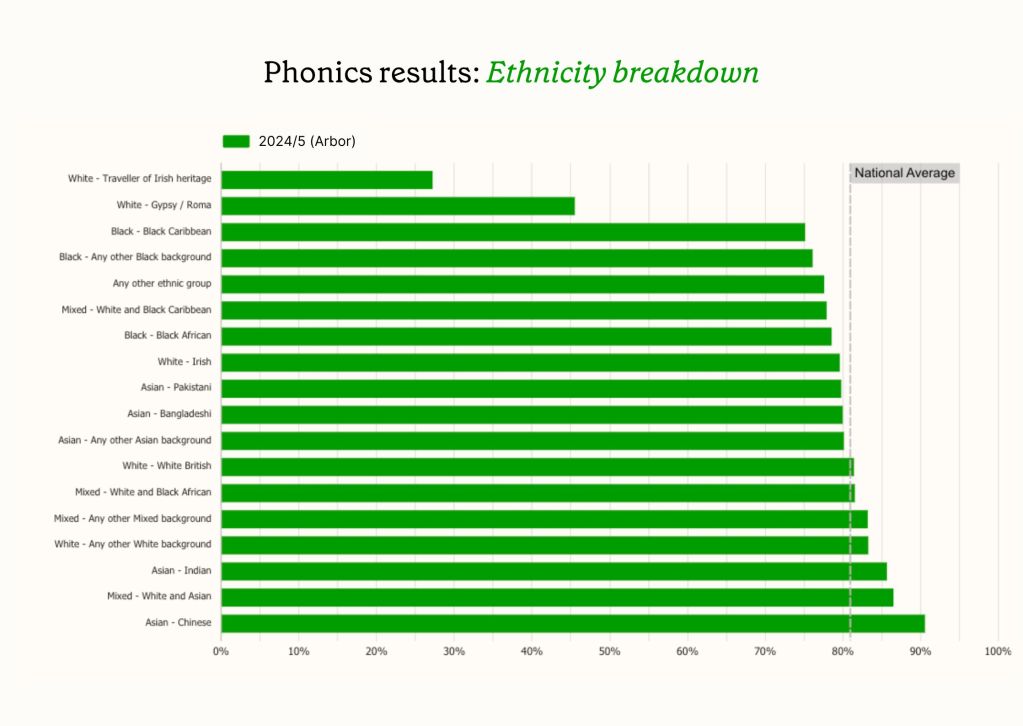 The 2024/25 results reveal significant variation in phonics achievement across different ethnic groups: