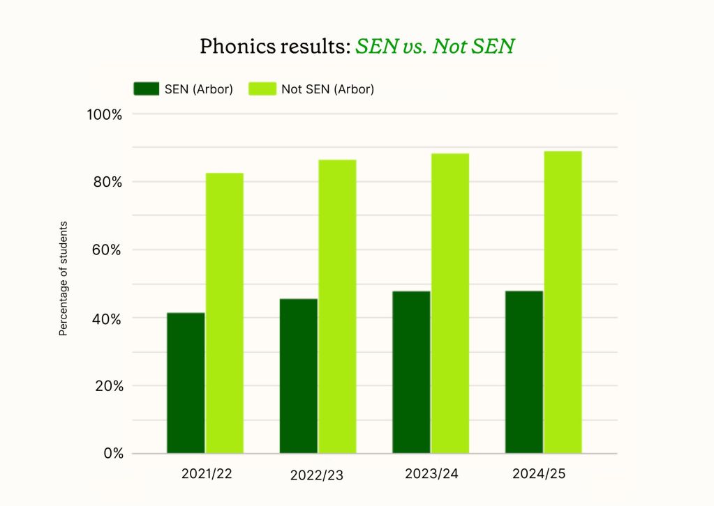 Students with Special Educational Needs (SEN) continue to face significant challenges in phonics achievement. In 2024/25, 47.7% of SEN students met the expected standard, compared to 88.8% of students without SEN.
